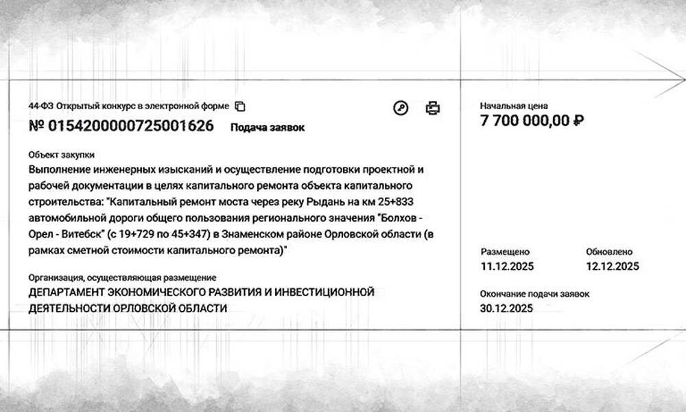 Стартовала процедура поиска подрядчика на разработку ПСД, а значит, ремонт моста через реку Рыдань — в планах региональной власти. КУ ОО «Орёлгосзаказчик» разместил тендер по поиску подрядчика на выполнение инженерных изысканий, разработку проектной и рабочей документации на капремонт моста через
