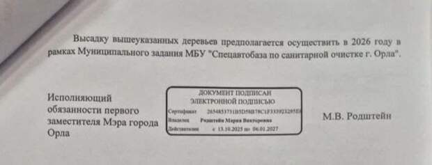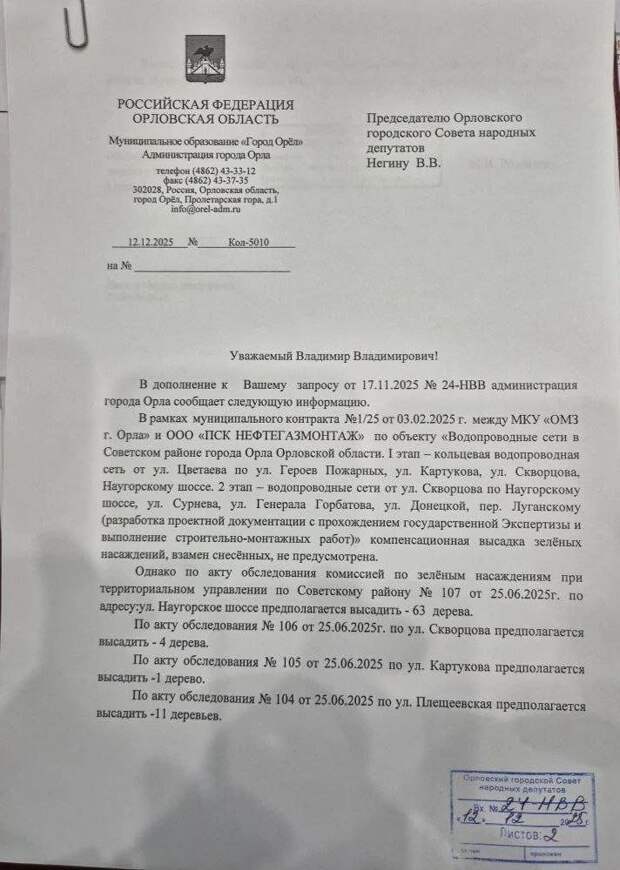 «В рамках муниципального контракта между МКУ «ОМЗ Орла» и ООО «ПСК Нефтегазмонтаж» по объекту «Водопроводные сети в Советском районе Орла» компенсационная высадка не предусмотрена. Однако по акту обследования комиссией по зелёным насаждениям при теруправлении по Советскому району по адресу: ул. Наугорское шоссе предполагается высадить — 63 дерева», — указывается в ответе Родштейн, которое опубликовала экс-депутат облсовета Валентина Остроушко.