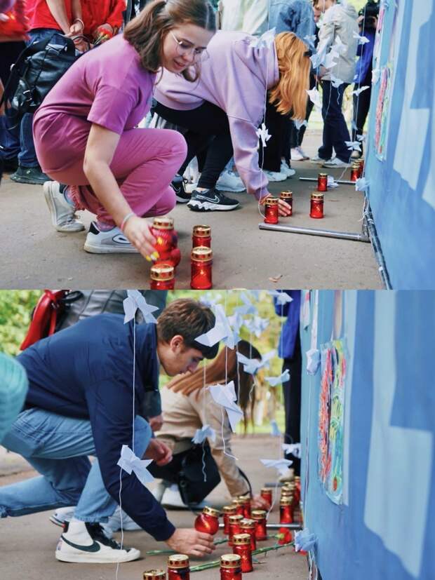 Сегодня в Городском парке культуры и отдыха Орла собралась неравнодушная молодёжь. Из рисунков детей, обличающих терроризм, сделали импровизированный мемориал. К нему учащиеся школы №39 им. Фридриха Шиллера и студенты Орловского техникума сферы услуг возложили горящие лампадки. Затем молодёжь читала стихи и пела песни в память о погибших.