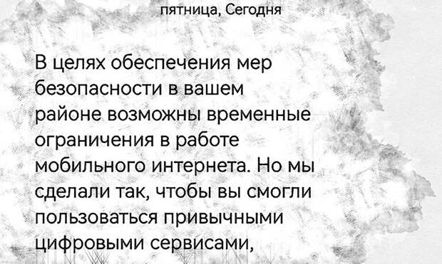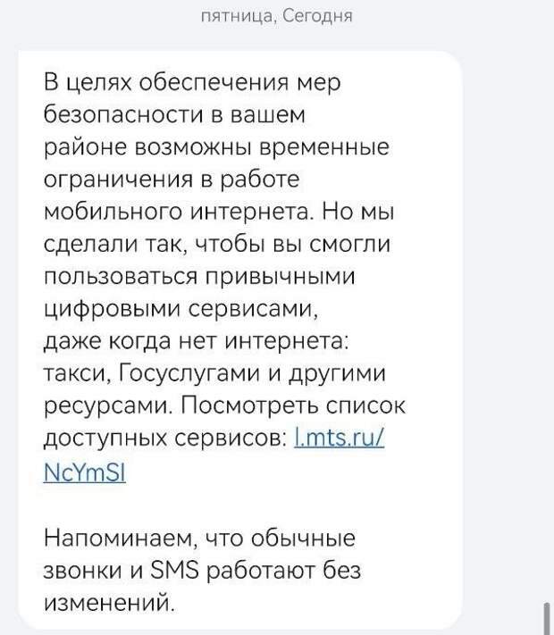 «В целях обеспечения мер безопасности в вашем районе возможны временные ограничения в работе мобильного интернета.… Напоминаем, что обычные звонки и SMS работают без изменений», – сказано в сообщении оператора.