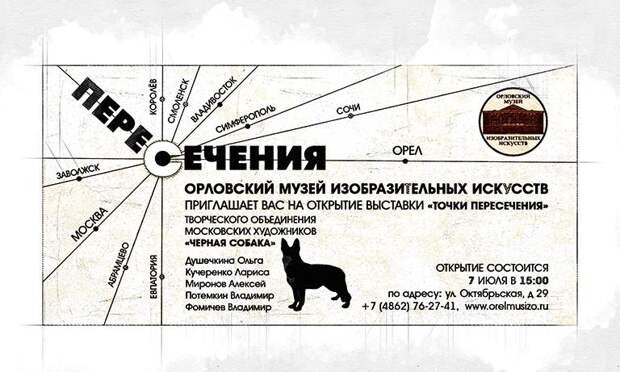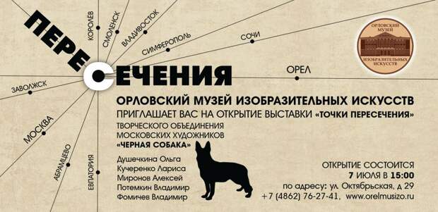 Первой их «Точкой пересечения» стал Владивосток. С тех пор современные передвижники ездят по стране, устраивая выставки и работая на пленэрах. Орёл станет десятой «Точкой пересечения» для творческой группы.В экспозиции будут представлены работы пяти художников «Чёрной собаки» – членов Союза художников РФ Ольги Душечкиной, Ларисы Кучеренко, Алексея Миронова, Владимира Потёмкина и Владимира Фомичева. Всех их объединяет реалистический метод, увлечение импрессионизмом и верность российским мотивам, которые увидены и запечатлены ими по-разному. Зрителям покажут эпические, философские, лирические и экспрессивно-яркие образы русской природы и жизни.