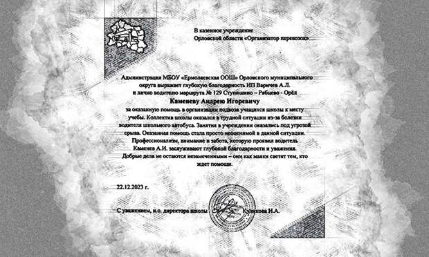 Также «Организатор перевозок» опубликовал благодарственное письмо, написанное администрацией школы, в адрес водителя и его работодателя ИП Варичева А.Л.