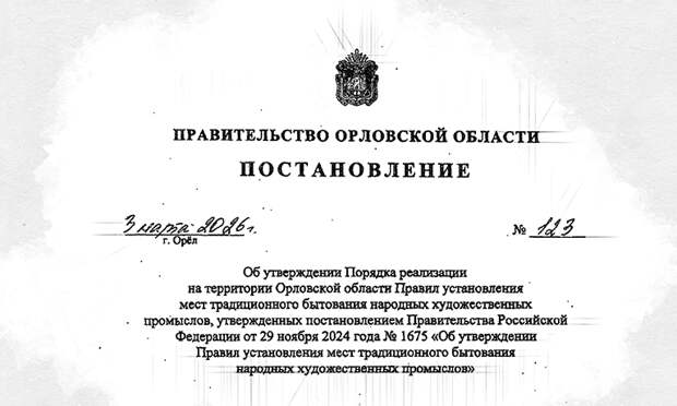 Региональное правительство утвердило порядок реализации на территории Орловской области правил установления мест традиционного бытования народных художественных промыслов (НХП).