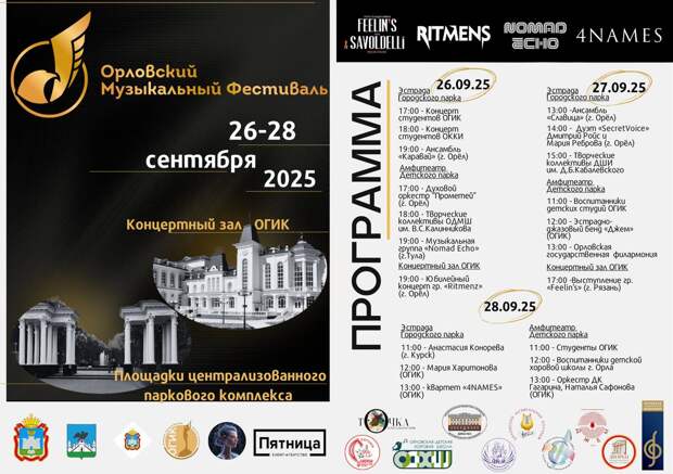 Организаторы обещают: будет масштабно, ярко и очень талантливо.В афише наибольший интерес представляют выступления итальянского вокалиста Бориса Саволделли, группы «FEELIN’S» (г. Рязань), коллектива «Nomad Echo» (г. Тула), участника проекта Первого канала «Голос 60+» Владимира Прибылова (г. Орёл) Фестиваль приурочен ко Дню основания Орловской области, который отмечается 27 сентября. В этом году нашему региону исполняется 88 лет. Вход на мероприятие свободный. 0+ Фото: Орловский государственный институт культуры