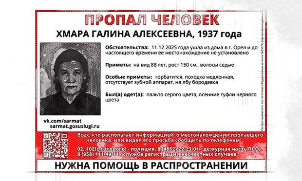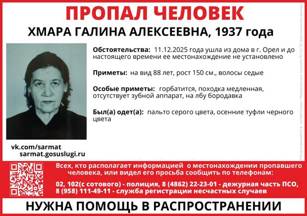 Близкие пенсионерки обратились за помощью к активистам поисково-спасательного отряда «Сармат». Женщина имеет довольно приметную внешность: рост 150 см, при ходьбе сильно горбится, отсутствуют зубы, на лбу бородавка.