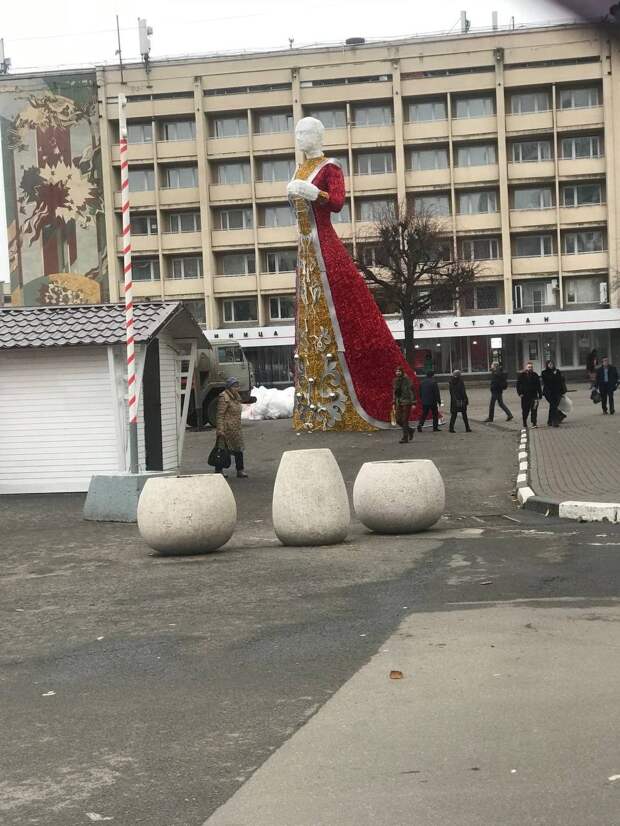 Накануне на площади Ленина, напротив гостиницы «Салют» появилась фигура Снегурочки в красной шубе с узорами. Очевидно, что работы по её сборке полностью не завершены.
