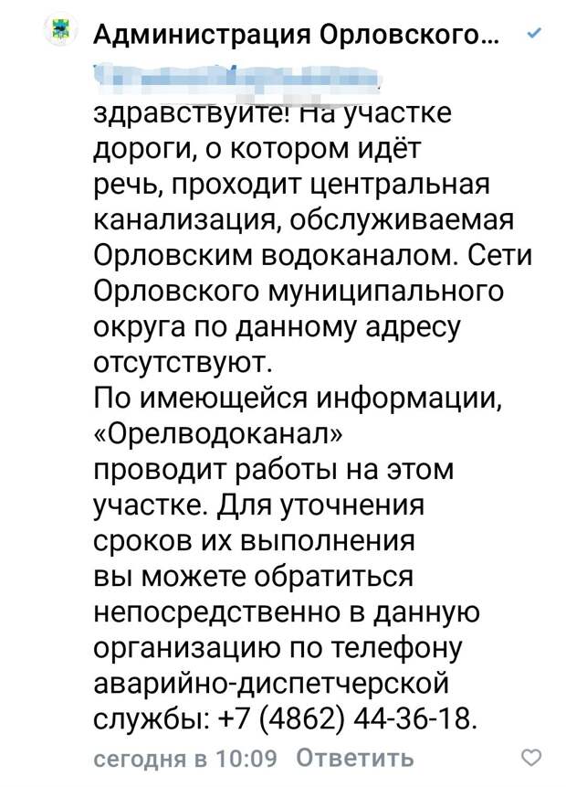 «Дважды был прорыв. Провалился грунт, земля уходила. Сейчас всё раскопали: канализация просто открыта. Образовалась огромная яма, глубина которой больше 6 метров. В ширину — метров 15. Обрушение идёт полным ходом. Зловоние невозможное. Просто жуть, что творится. Сейчас разольётся Ока, и все эти фекалии просто потоком стекут в реку.  Но это, похоже, никого не волнует. Обратилась к губернатору, меня переадресовали в Администрацию Орловского МО, а там — в «Водоканал». Закольцевались! Там сроков назвать не могут. Это не просто яма — это серьёзная угроза экологии! Такое уже было с прорывом в Орле, когда власть нам рассказывала, что ничего в реку не стекает», — отметила в диалоге с ОрелТаймс орловчанка. В подтверждение своих слов горожанка прислала и ответ Администрации Орловского МО. В нём указывается, что «Орёлводоканла» проводит некие работы, однако сроки завершения орловчанке рекомендовали уточнить в самой организации.  Отметим: орловчанка вспомнила историю с аварией на канализационном коллекторе в районе улицы Октябрьской. Здесь в конце 2025 года произошло обрушение колодца, что привело к сбросу неочищенных сточных вод в реку Орлик.