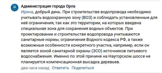 Именно по этой причине на Наугорском шоссе не планируется компенсационная высадка деревьев», — указывается в ответе с аккаунта пресс-службы городской администрации.Напомним: активная вырубка деревьев напротив Казанского храма по Наугорскому шоссе началась 12 октября. Как ещё тогда ОрелТаймс сообщали очевидцы, сносу подверглись здоровые деревья.