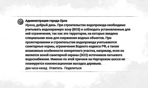 Причина, на которую ссылается власть, довольно витиеватая, но по сути она сводится к нормам и правилам, которые необходимо соблюдать при строительстве водопровода по Наугорскому шоссе.