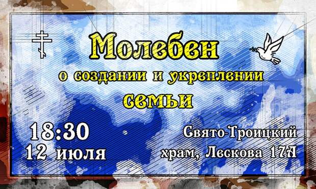 В Свято-Троицком храме города Орла 12 июля совершат молебен о создании и укреплении семьи. Начало в 18:30.