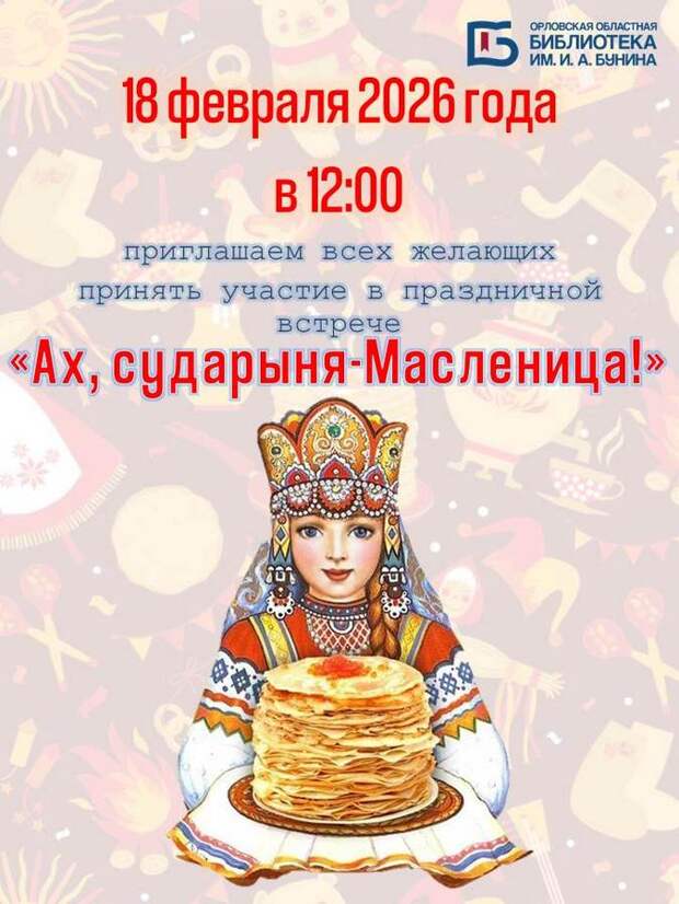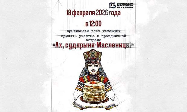 В Орловской областной научной универсальной публичной библиотеке имени И.А. Бунина состоится праздничная встреча «Ах, сударыня Масленица!». В гости приглашаются все желающие, старше 12 лет.