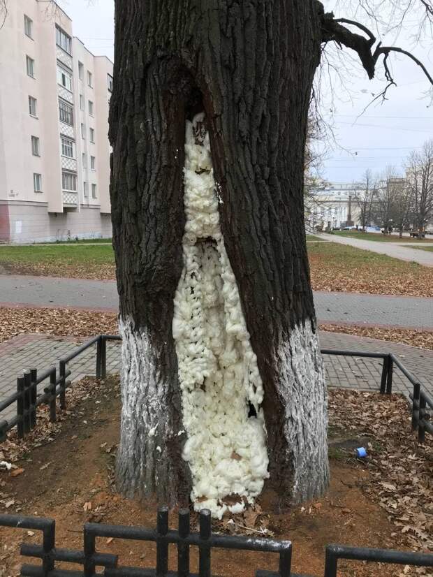 Ремонт дубов монтажной пеной на днях был проанонсирован городской администрацией как хороший способ лечения деревьев. Мол, старый верный метод – зачистить рану, замазать садовым варом, а потом зацементировать – это прошлый век.