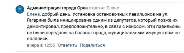 «Установка остановочных павильонов на ул. Гагарина была инициирована одним из депутатов, который позже их демонтировал, предположительно, в связи с износом. Эти павильоны не были переданы на баланс города, муниципальным имуществом не являлись», — указывается в ответе с аккаунта пресс-службы мэрии.