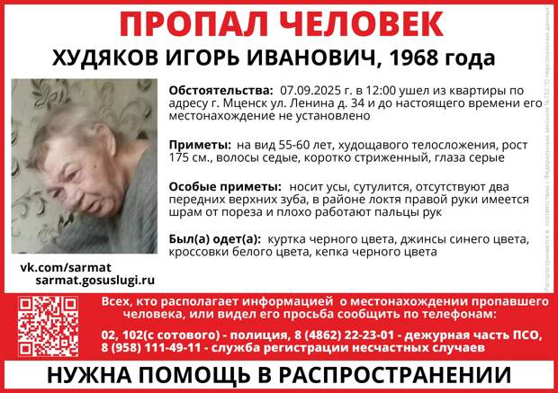 МО МВД России «Мценский» занимается поиском 57-летнего Игоря Худякова, который ушёл из дома в Мценске ещё 7 сентября и до сих пор не вернулся. Близкие Игоря даже примерно не знают, где может находиться мужчина. К поиску присоединился и поисковый спасательный отряд «Сармат». Приметы: рост 175 см, короткие волосы, серые, глаза, худощавого телосложения.