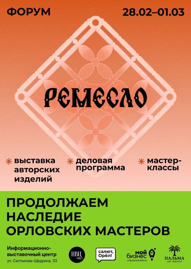28 февраля и 1 марта на площадке областного Информационно-выставочного центра впервые пройдёт творческий форум «Ремесло». Орловцы смогут посетить ярмарку уникальных авторских изделий из керамики и текстиля.