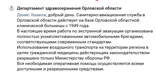 Ответ регионального депздрава спокойствия не добавил: «Санитарно-авиационная служба в Орловской области действует на базе Орловской областной клинической больницы с 1949 года. В настоящее время работа по экстренной эвакуации организована полностью укомплектованными автомобильными бригадами, соответствующими современным стандартам. Использование воздушного транспорта на территории региона в целях гражданской медицины действующим законодательством разрешено только Министерству обороны РФ. Вся необходимая оперативная помощь осуществляется всеми доступными и разрешёнными средствами». Но насколько она эффективна? Вот одна из последних историй: в Мценске на экстренный вызов медиков ждали свыше 3,5 часов. «Умереть 10 раз успеешь», — так охарактеризовала ситуация амчанка.