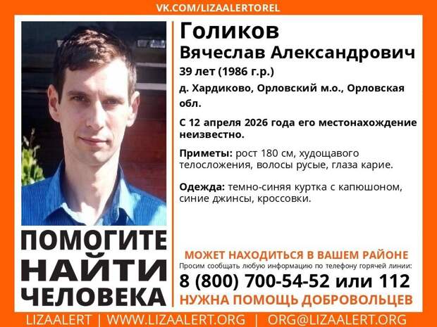 Волонтёры поискового отряда «ЛизаАлерт» распространили ориентировку на очередного пропавшего человека. На этот раз ведутся поиски 39-летнего Вячеслава Александровича Голикова.