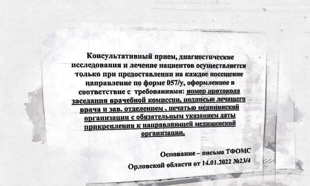 Документ должен быть с номером протокола заседания врачебной комиссии, подписью лечащего врача и зав.отделением, печатью медорганизации с обязательным указанием даты прикрепления к направляющей медицинской организации. Основанием для предъявления такой справки стало письмо ТФОМС Орловской области. Жители области возмутились очередными бюрократическими проволочками да ещё в разгар коронавируса.На ситуацию отреагировал руководитель орловского департамента здравоохранения Станислав Шувалов. Он отметил, что приём пациентов в медучреждении ведётся по программе государственных гарантий оказания бесплатной медицинской помощи в рамках направлений по форме 057/у. Однако, как заверил Шувалов, в условиях новой волны пандемии COVID-19 требование по представлению этой справки временно отменено.