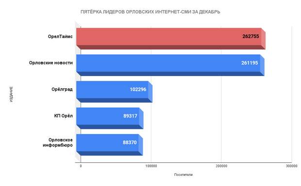 Закончился декабрь, и пора подводить итоги работы интернет-СМИ в последнем месяце ушедшего 2020 года. Как и ожидалось – впереди ОрелТаймс. Далее идут Орловские новости, Орелград, КП Орел и Орловское информбюро. Данные взяты из открытого статистического источника Liveinternet.ru.