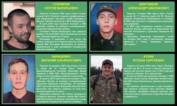 Сергей работал кинологом в Нарышкинской исправительной колонии (ИК-5), а в июне прошлого года подписал контракт с ЧВК «Вагнер». Спустя месяц, 19 июля, он погиб в бою за город Артёмовск. Его наградили пятью медалями, в том числе государственной «За отвагу» и вагнеровским «Чёрным крестом».Орловец Александр Братчиков погиб в 40 лет. Он учился в школе №17, окончил школу №35 в Орле. Затем получил образование в техникуме и Современной гуманитарной академии. В 2004 году, будучи в армии, принимал участие в Чеченской кампании. 14 октября 2022 года Александр Братчиков погиб в боях за Артёмовск. Его наградили медалью «За отвагу».