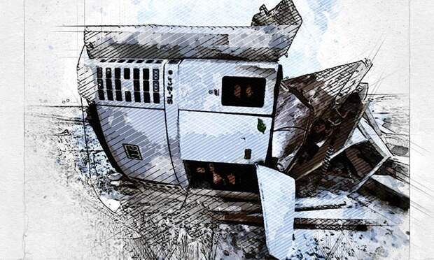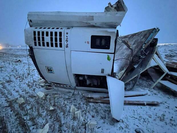 После вылета с дороги грузовик MAN перевернулся.