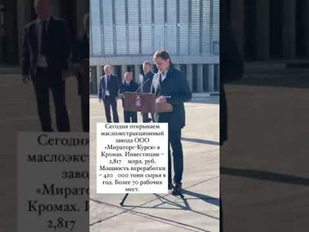 Сегодня губернатор Клычков и президент АПХ «Мираторг» Виктор Линник торжественно открыли первый в структуре агрохолдинга маслоэкстракционный завод ООО «Мираторг-Курск» в Кромском районе.