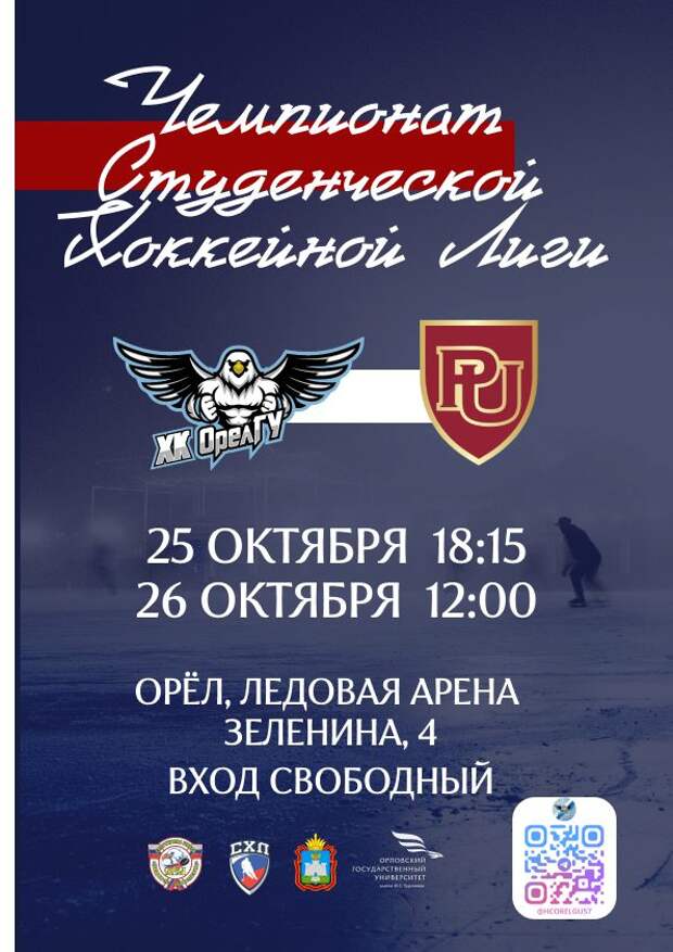 Вход для всех болельщиков свободный.В этом сезоне хоккеисты ОГУ уже встречались с хоккеистами РЭУ имени Плеханова. Матч состоялся в Орле в рамках Кубка «СХЛ-Запад» и завершился победой москвичей со счетом 4:2. Отметим, что до 59-й минуты этого матча счёт встречи был 2:2. Однако, одна из атак хоккеистов РЭУ оказалась успешной, и гости вышли вперёд.