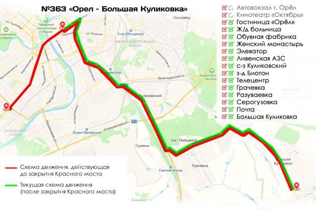 Жителей региона просят выбрать один из двух вариантов: Возврат к схеме движения, действующей до реконструкции Красного моста (с отправлением от автовокзала г. Орел); Сохранение текущей схемы движения (с отправлением от ост. «Гостиница Орёл»). Пройти опрос можно по следующим ссылкам: №363 «Орёл – Большая Куликовка» vk.com/wall-216826650_1360