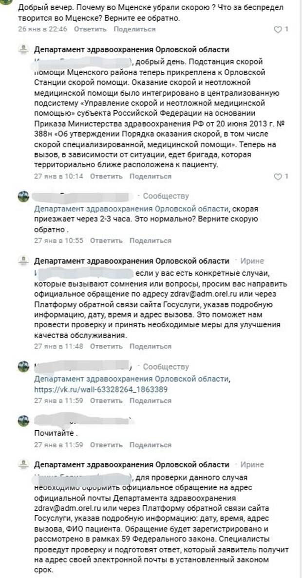 Данный пост открыл буквально «ящик Пандоры». В комментариях жители Мценска наперебой стали делиться своими историями:  «У нас давно уже «скорая» к нам из Орла приезжает. Например, у меня почка схватила, вызвала «скорую», приехала через два часа»;