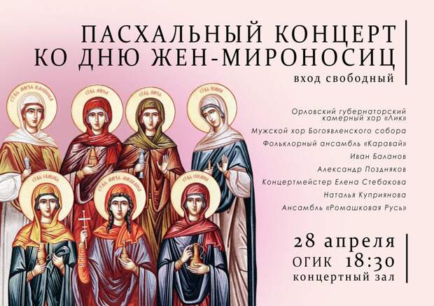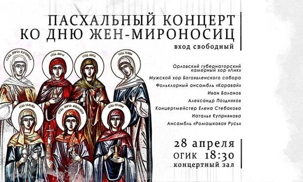 28 апреля в концертном зале ОГИК состоится Пасхальный концерт, приуроченный ко Дню жён-мироносиц. Речь идёт о последовательницах Иисуса Христа, которые первыми пришли к погребальной пещере, чтобы совершить помазание тела миром. Считается, что они стали первыми свидетелями Воскресения и первыми рассказали о нём.