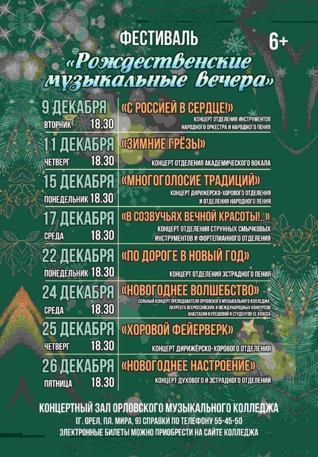 В Орле анонсировали программу ежегодного фестиваля «Рождественские музыкальные вечера». С 9 по 26 декабря в Орловском музыкальном колледже будет много творчества, музыки и вдохновения. В концертной афише и «Хоровой фейерверк», и «Многоголосие традиций» и «Новогоднее настроение». – Зрителей ждут яркие выступления солистов, разнообразные номера вокальных и инструментальных ансамблей, незабываемые встречи со всеми оркестрами колледжа, рождественская программа академического хора и многое-многое другое!