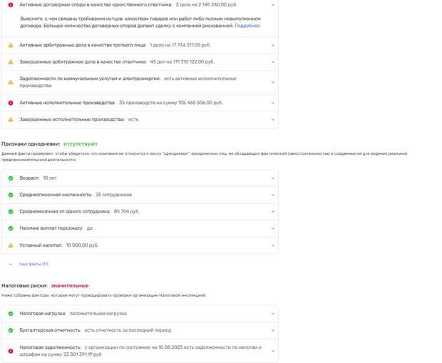 Компания выступает ответчиком по активным договорным спорам на сумму в 2,3 млн рублей. Есть задолженность по налогам (свыше 33 млн рублей), оплате электроэнергии и коммунальным платежам. Указывается, что рассматривается дело о банкротстве.