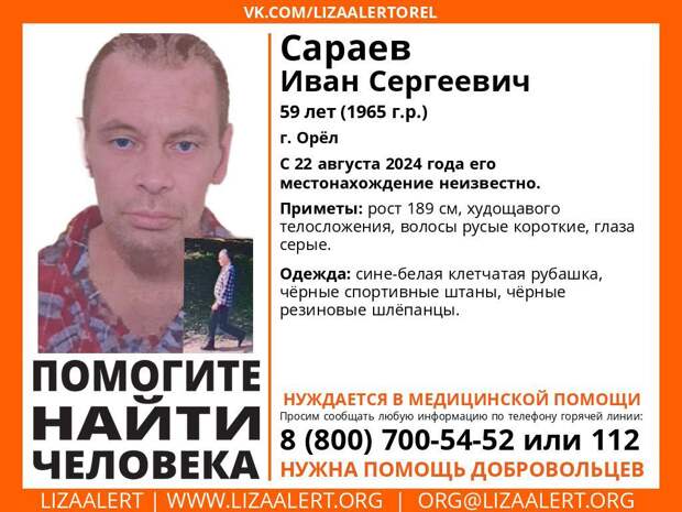 Сообщается, что пропал Иван Сергеевич Сараев, житель города Орла.