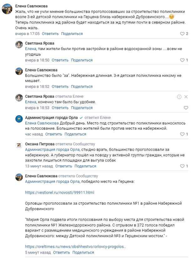 «Жаль, что не учли мнение большинства проголосовавших за строительство поликлиники возле 3-й детской поликлиники на Герцена, вблизи набережной Дубровинского. Теперь поликлиника Ж/д района будет находиться почти в Северном районе. Очень жаль», — посетовали орловцы.