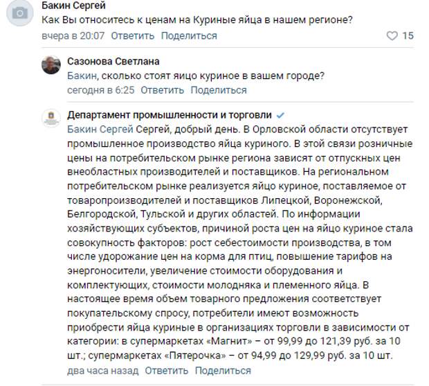 Свои вопросы горожане адресовали губернатору Клычкову в рамках его прямого эфира ВКонтакте. Из ответа Департамента промышленности и торговли выяснилось, что яйца в Орловской области дорожают в связи с отсутствием на территории региона промышленного производства куриного яйца . «В этой связи розничные цены на потребительском рынке региона зависят от отпускных цен внеобластных производителей и поставщиков. На региональном потребительском рынке реализуется яйцо куриное, поставляемое от товаропроизводителей и поставщиков Липецкой, Воронежской, Белгородской, Тульской и других областей. По информации хозяйствующих субъектов, причиной роста цен на яйцо куриное стала совокупность факторов: рост себестоимости производства, в том числе удорожание цен на корма для птиц, повышение тарифов на энергоносители, увеличение стоимости оборудования и комплектующих, стоимости молодняка и племенного яйца», — сказано в ответе Департамента промышленности и торговли.