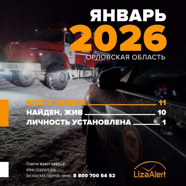 Поисковый отряд «ЛизаАлерт» Орловской области поделился статистикой за первый месяц 2026 года. Завершается он со знаком «плюс» – большинство заявок отработано со статусом «Найден. жив».