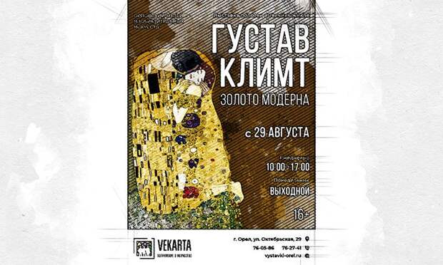 Визитной карточкой и главным индикатором узнаваемости Климта для многих стала картина «Поцелуй», репродукцию которой предприимчивые продавцы печатают на всём, на чём можно, начиная от кружек и брелоков, заканчивая дамскими сумочками. Работы орловскому музею предоставила компания «Арт Экспо» из сети галерей «Vekarta».