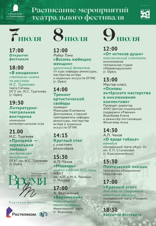 Воронеж), молодёжный театр «Предел» (г. Скопин), молодёжный театр «Круг-2» им. Е.П. Ступаковой (г. Краснознамёнск), театр Сатиры ОГУ им. Тургенева, ОГАТ им. Тургенева, инклюзивная театральная студия «Неравнодушные» (г. Орёл) и др.Зрители увидят две постановки по произведениям И.С. Тургенева («В ожидании» и «Призраки – нереальная любовь»), и две – «по Чехову» («Медведь» и «О вреде табака»), моноспектакль «Вертинский», студенческий спектакль «Восемь любящих женщин», обрядовый спектакль «Красный угол», а также пластический спектакль «От истоков души», который сыграют «особенные» дети. Почти все они будут сыграны на площадках под открытым небом.