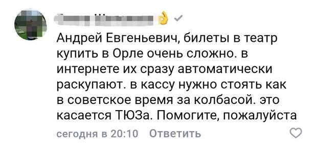 «Андрей Евгеньевич, билеты в театр купить в Орле очень сложно. В интернете их сразу автоматически раскупают.