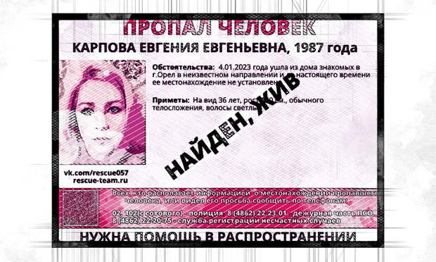 «Найдена, жива! Местонахождение Карповой Е.Е. установлено», — гласит надпись на фото ориентировки.