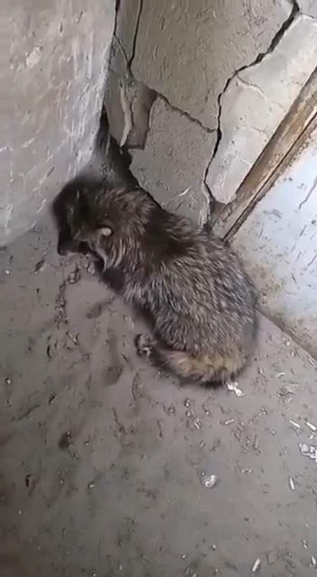 Енот под подвальным козырьком находится вторые сутки. Его случайно заметили сотрудники Фонда социального страхования.