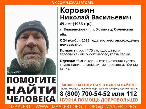 Ещё один человек пропал в Орловской области. На этот раз поисковики опубликовали ориентировку на 69-летнего Николая Васильевича Коровина, которого не могут найти с 24 ноября.