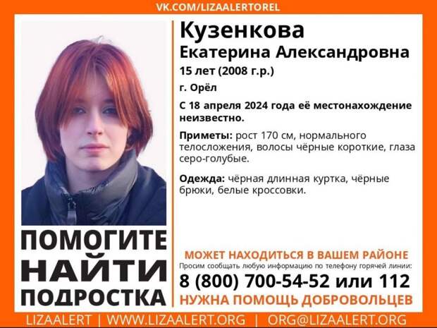 В Орле пропала 15-летняя Екатерина Кузенкова. Об этом сообщил орловский поисковый отряд «ЛизаАлерт».