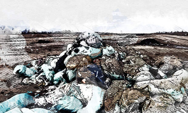 В нескольких кучах навалены десятки мешков «с трикотажной». В одной из них — отходы, оставшиеся, видимо, после шитья экипировки для военных.