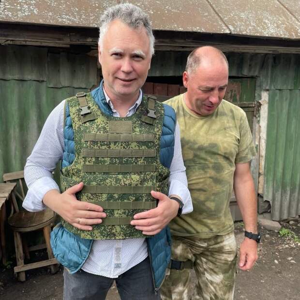 На фотографиях с места события, о котором предусмотрительно не сообщается, счастливые лица народных избранников, коробки с презентами и сам Нерушев, нацепивший броник Строева.