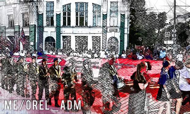 В центре Орла 4 августа под звуки оркестра развернули многометровый дубликат Знамени Победы.