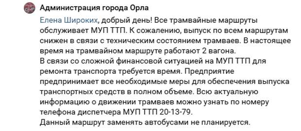 «Все трамвайные маршруты обслуживает МУП «ТТП». К сожалению, выпуск по всем маршрутам снижен в связи с техническим состоянием трамваев. В настоящее время на трамвайном маршруте работают 2 вагона. В связи со сложной финансовой ситуацией на МУП «ТТП» для ремонта транспорта требуется время. Предприятие предпринимает все необходимые меры для обеспечения выпуска транспортных средств в полном объёме. Маршрут №1 заменять автобусами не планируется», — ответили с аккаунта пресс-службы горадминистрации. Отметим: о сложном финансовом положении, принятии мер, запланированном участии региона в некой федеральной программе по обновлению подвижного состава и т.д. и т.п. местная власть рапортует уже несколько лет. А становится всё только хуже. Вряд ли что-то способен изменить и назначенный на должность руководителя МУП «ТТП» Игорь Афонин. Муниципальное предприятие умирает на наших глазах. Последняя надежда – на перевод МУП «ТТП» на региональный уровень, который должен произойти в 2027 году. Доживёт ли электротранспорта Орла до этого момента — вот вопрос.