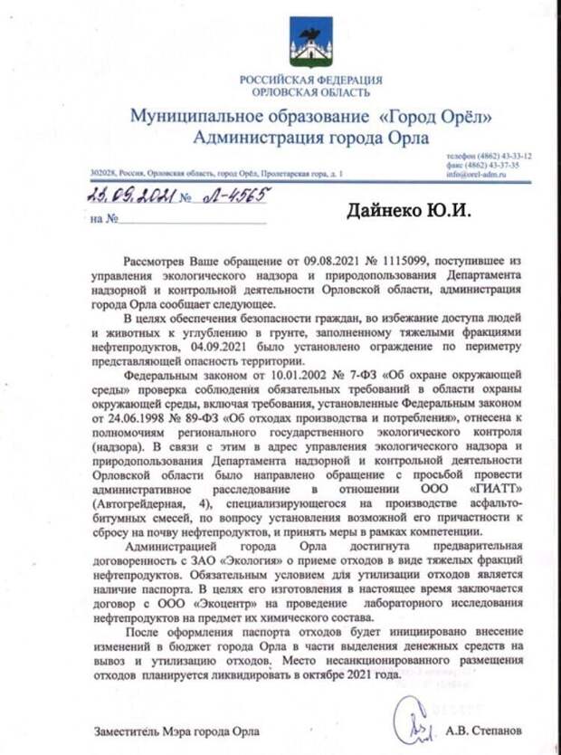 «Сегодня мы в очередной раз были на «котловане смерти» на ул. Автогрейдерной. Минул год с момента обещания администрации Орла, возглавляемой вами, г-н Парахин, как нам обещали к октябрю 2021 года все это безобразие ликвидировать. Увы, и старый котлован на месте, так рядом появился и новый, уже наполнившийся смолой. Вас действительно не волнуют эти проблемы?», — обратилась к мэру горожанка. В подтверждение своих слов орловчанка приложила ответ городской администрации на обращение местных жителей. В нём чёрным по белому указано, что в адрес Департамента надзорной и контрольной деятельности ещё год назад было направлено обращение с просьбой провести административное расследование по возможному причастию к сбросу в данном месте нефтепродуктов ООО «ГИАТТ», специализирующегося на производстве асфальто-битумных смесей. Кроме того, мэрия утверждала, что была достигнута определённая договорённость с ЗАО «Экология» о приёме отходов в виде тяжёлых фракций нефтепродуктов.