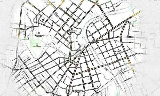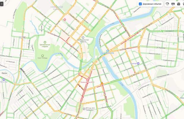 Согласно данным сервиса «Яндекс.Карты», практически весь центр областной столицы стоит в пробках. Также сложности наблюдаются и на основных въездах в город.