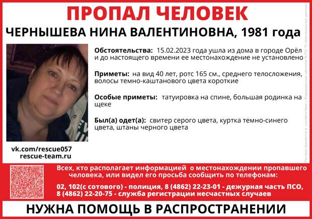 В Орле разыскивают Чернышеву Нину Валентиновну 1981 года рождения. Женщина 15 февраля ушла из дома и до настоящего времени её местонахождение не установлено. Об этом сообщается на странице официальной группы поисково-спасательного отряда «Сармат».